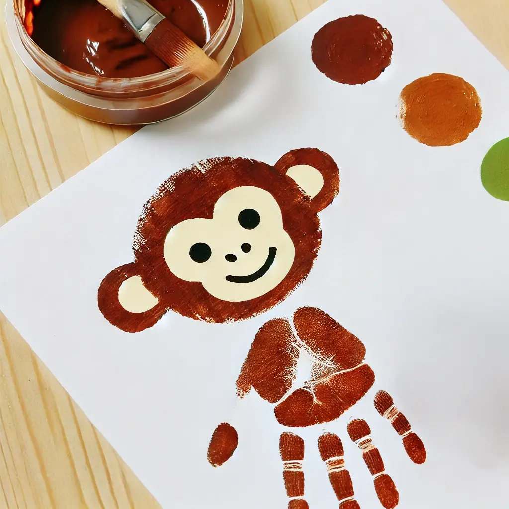 Male deinen Daumen mit brauner Farbe an und drücke ihn dann zweimal auf das Papier, um die Ohren des Affen zu erstellen. Male den Daumen erneut an und drücke ihn ein drittes Mal auf das Papier, um den Kopf des Affen zu formen.