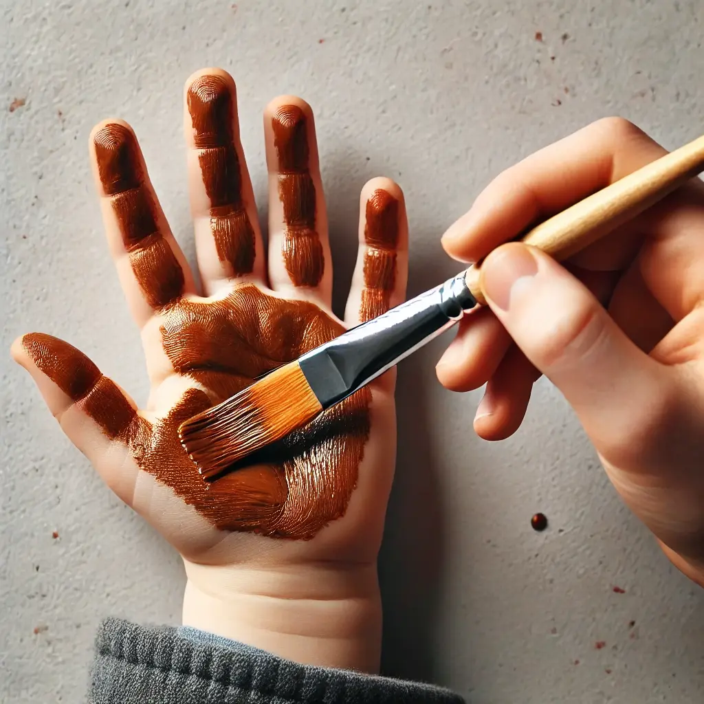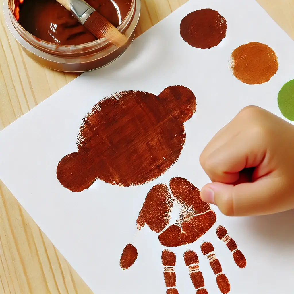 Bemale deine Hand vollständig mit brauner Farbe. Drücke dann die bemalte Hand fest auf ein weißes Blatt Papier. Dadurch entsteht der Körper des Affen auf dem Papier.