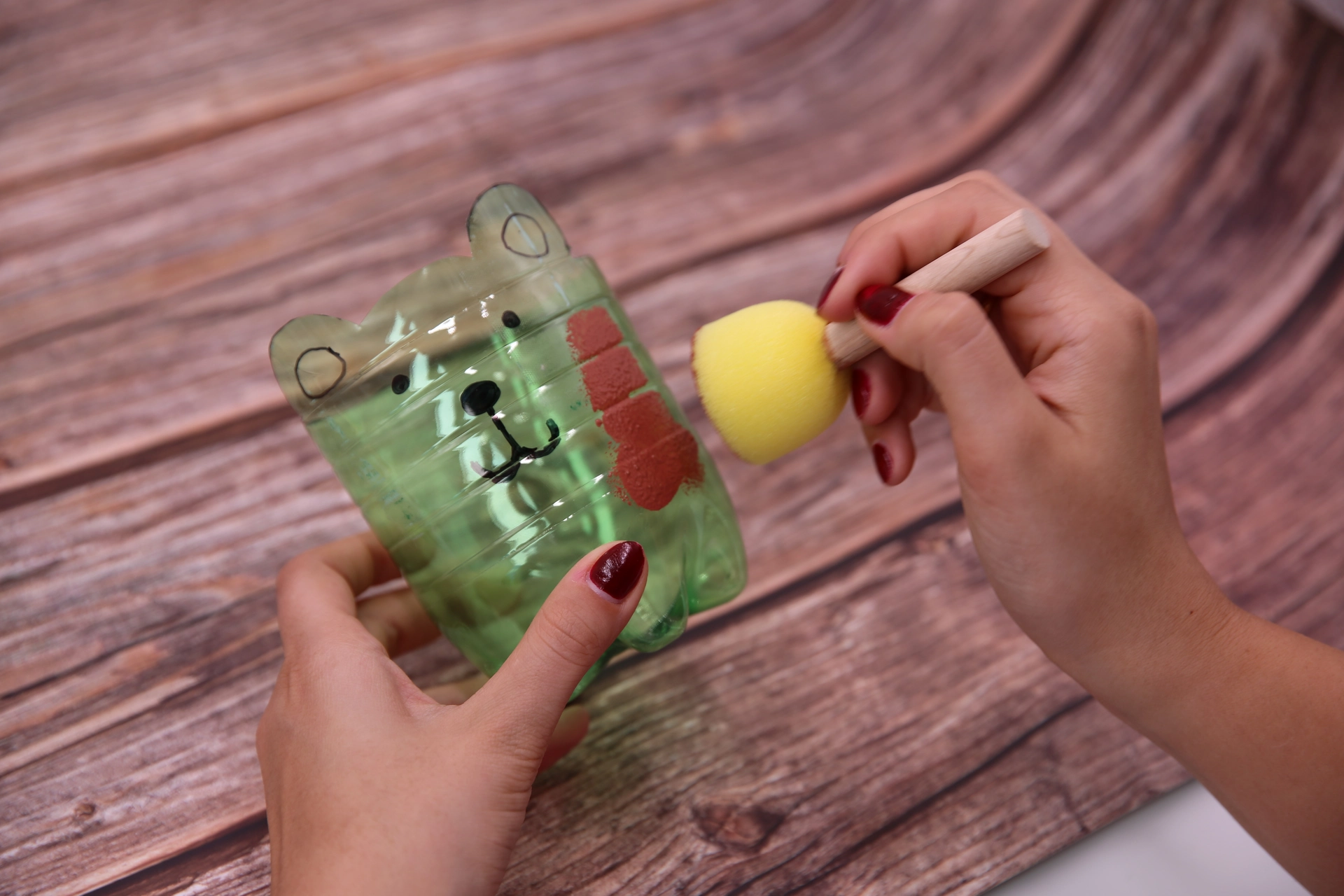 Tragt mit dem Pinselschwamm oder Pinsel die Farbe auf. Wenn sie nicht richtig deckt, malt die Flasche ein zweites Mal an.