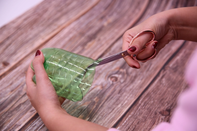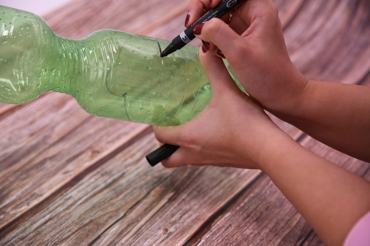 Schneidet die Flasche erst oberhalb eurer Markierung grob auseinander, dann noch einmal sauber an dieser entlang. Am besten funktioniert das, wenn ihr den Deckel abschraubt.