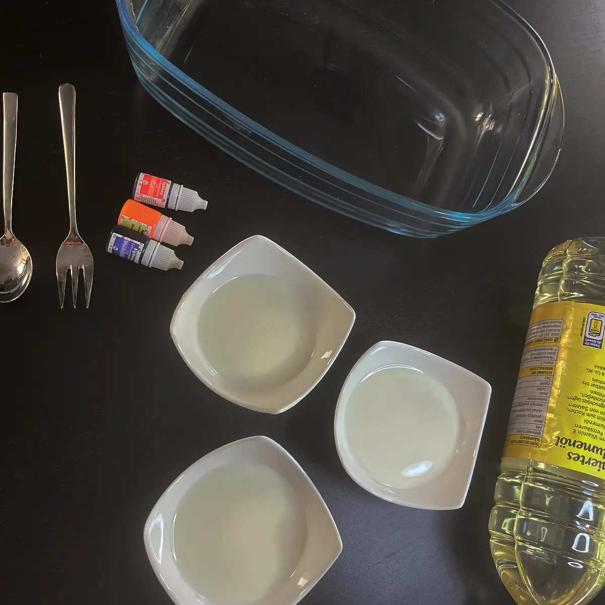 Um tolle und vor allem bunte Öl-Bilder zu gestalten, wird zunächst eine Schüssel mit etwas Öl gefüllt. Der Boden der Schüssel sollte komplett bedeckt sein.