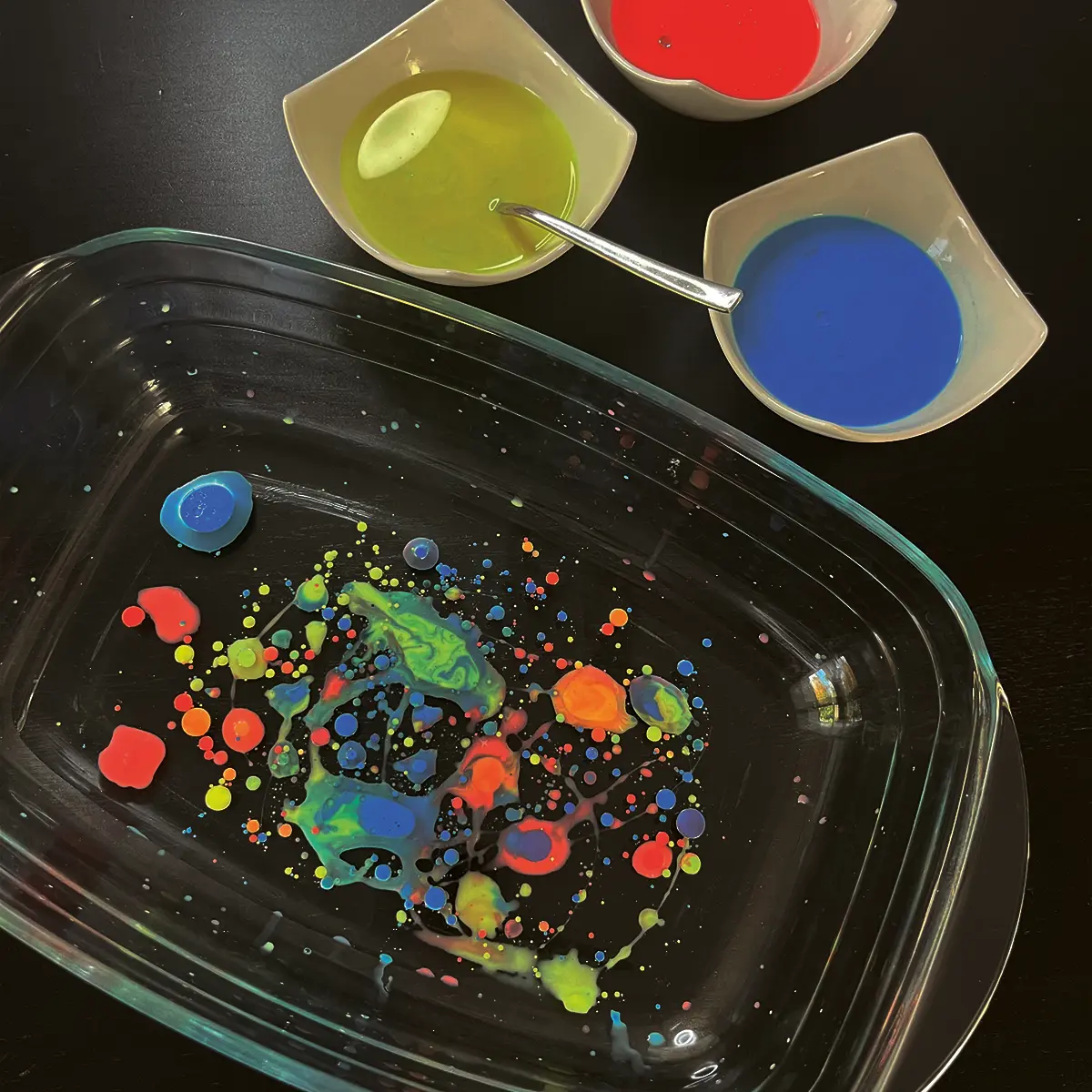 Milch auf kleine Behälter aufteilen und mit einigen Tropfen Lebensmittelfarbe einfärben. Gut umrühren.