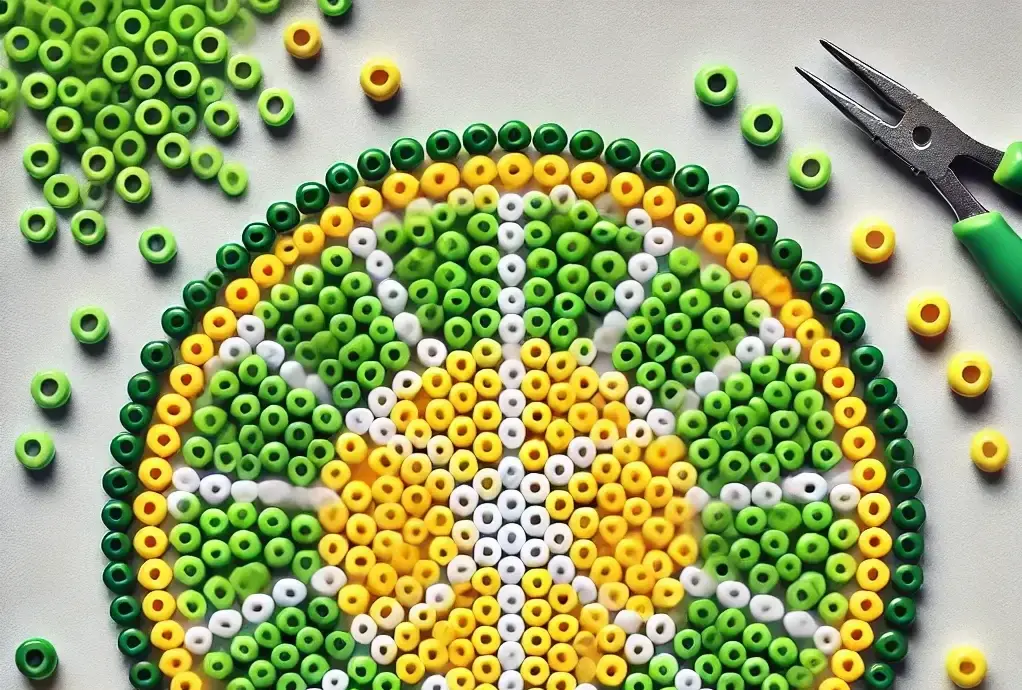 Lege die Bügelperlen auf die Platte und lass in der Mitte eine Perle weg für den Strohhalm. Bei dickeren Stohhalmen eventuell eine Perlenreihe mehr weglassen. Ohne Loch eignet es sich als Untersetzer.