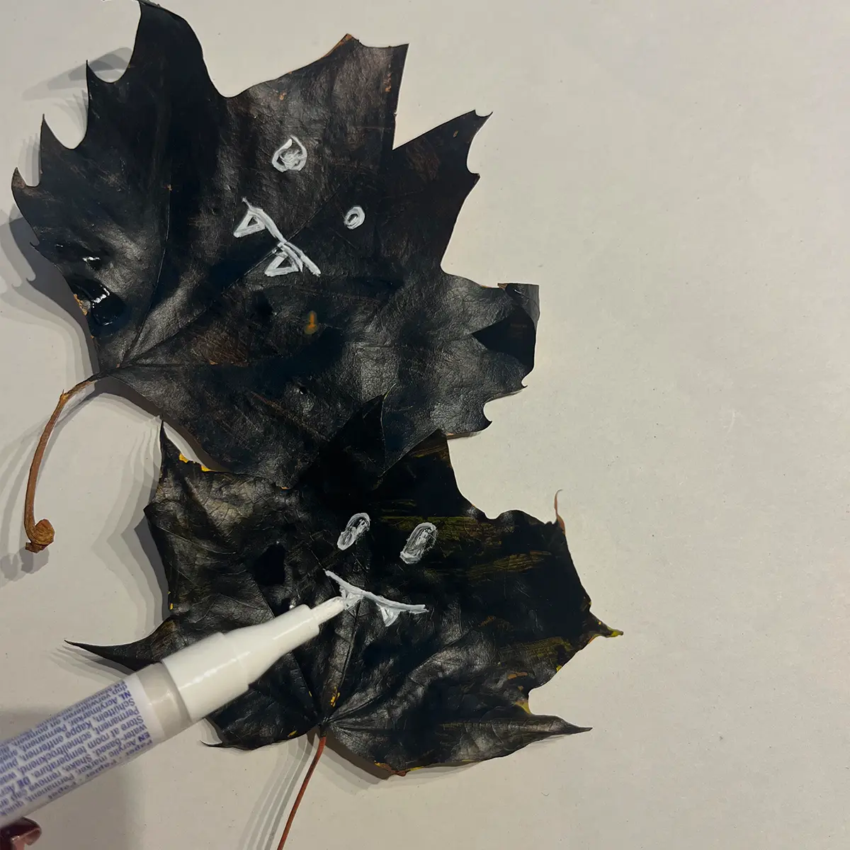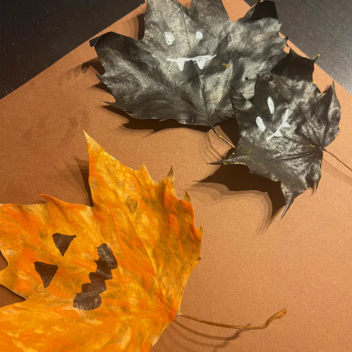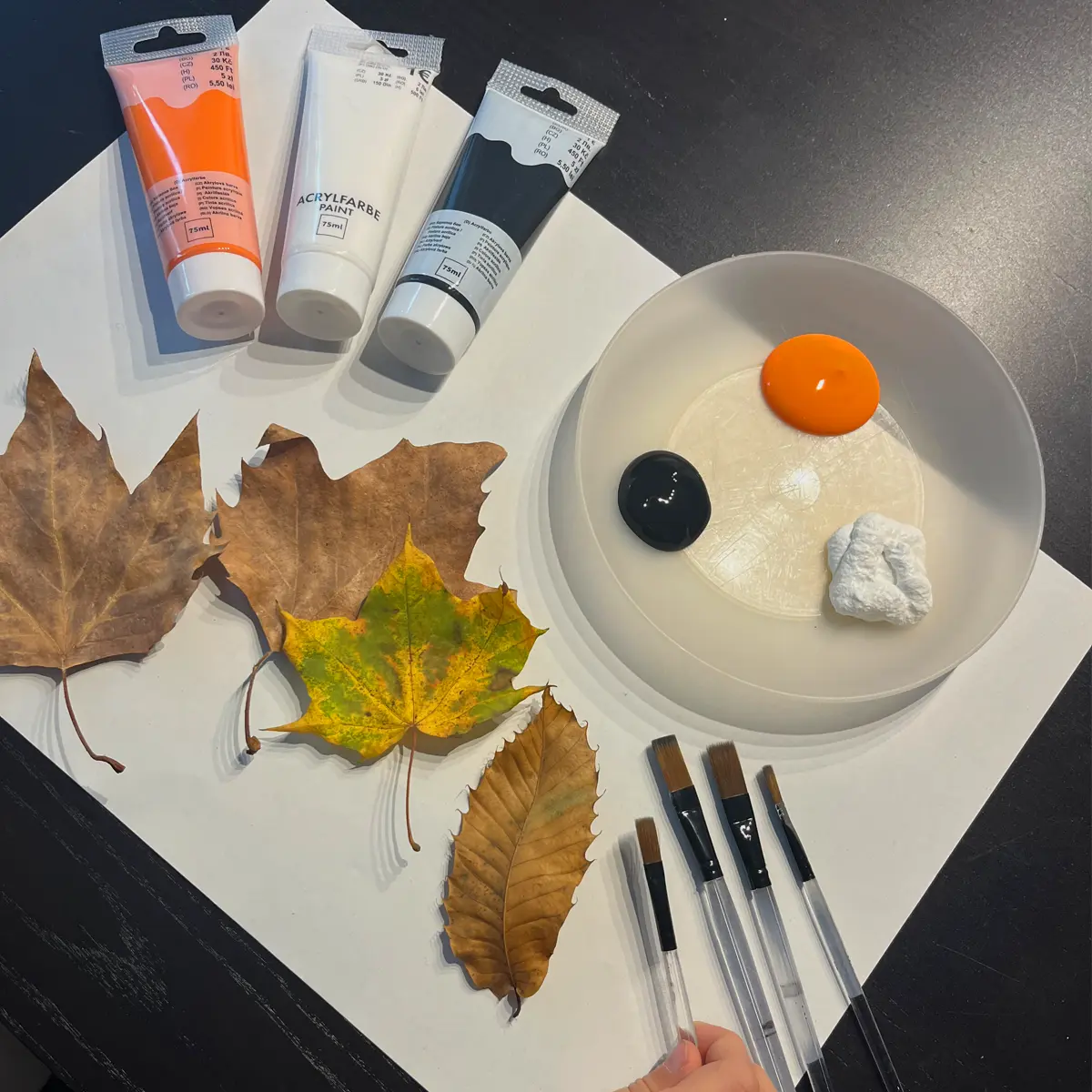 Malt ein längeres, schmales Blatt in Weiß an. Größere und breitere Blätter (z.B. ein Ahorn-Blatt) werden in Orange und Schwarz angemalt. Die Blätter zum Trocknen weglegen.