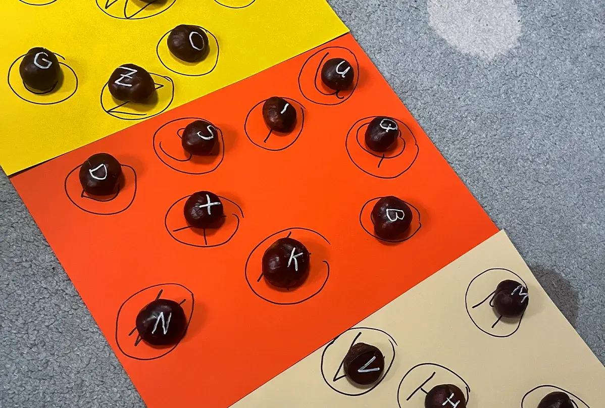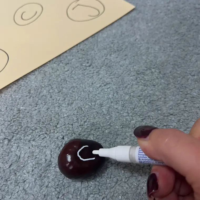 Die Kastanien mit einem weißen Marker mit dem kompletten Alphabet versehen und die Schrift gut trocknen lassen.