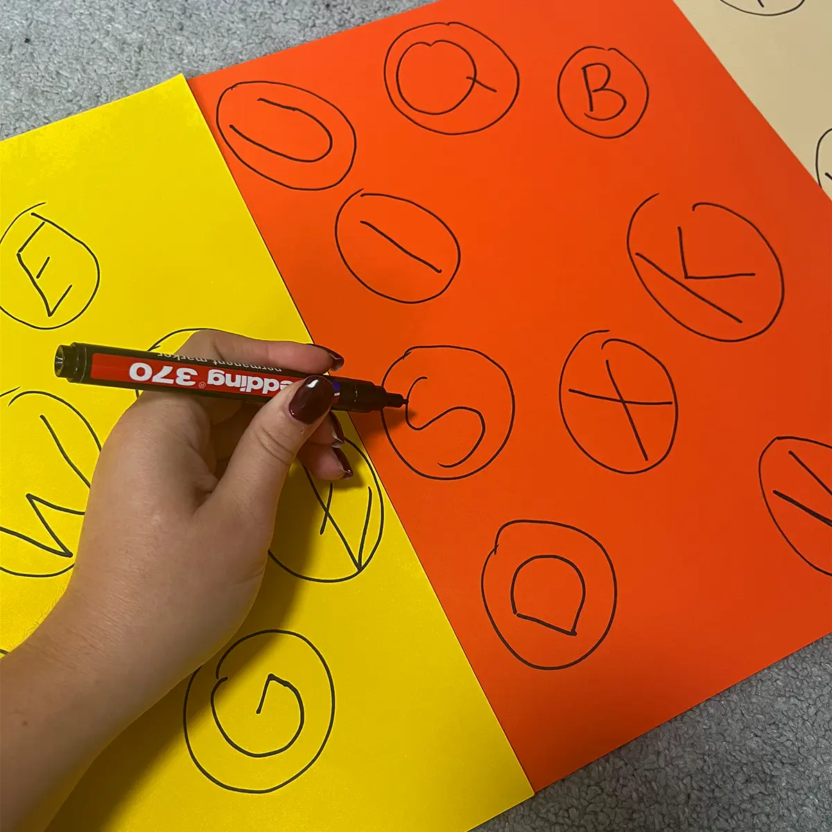 Auf einer großen Pappe (oder mehreren kleinen zusammengeklebten) mit einem schwarzen Marker alle Buchstaben des Alphabets durcheinander aufschreiben und umkreisen.