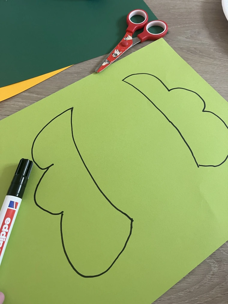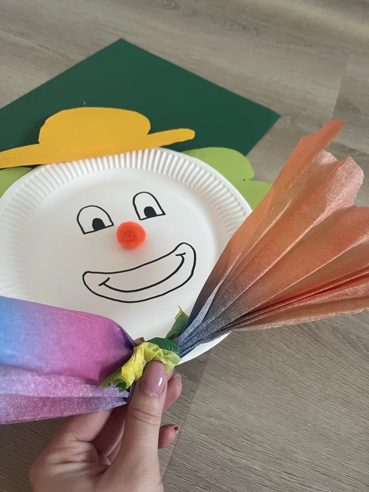 Auf der bunten Pappe werden voluminöse Haare und witzige Hüte vorgemalt und mit der Schere ausgeschnitten. Die Haare können entweder hinter den Papptellerrand oder auf den -rand geklebt werden. Der Hut wird mitti