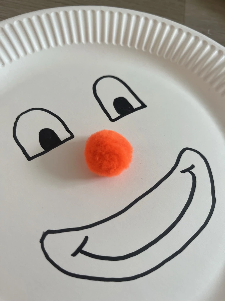 Zunächst werden auf die Pappteller große Augen und lustige Münder für unsere Clowns gemalt. Ein farbiger Pompon wird als Nase aufgeklebt.