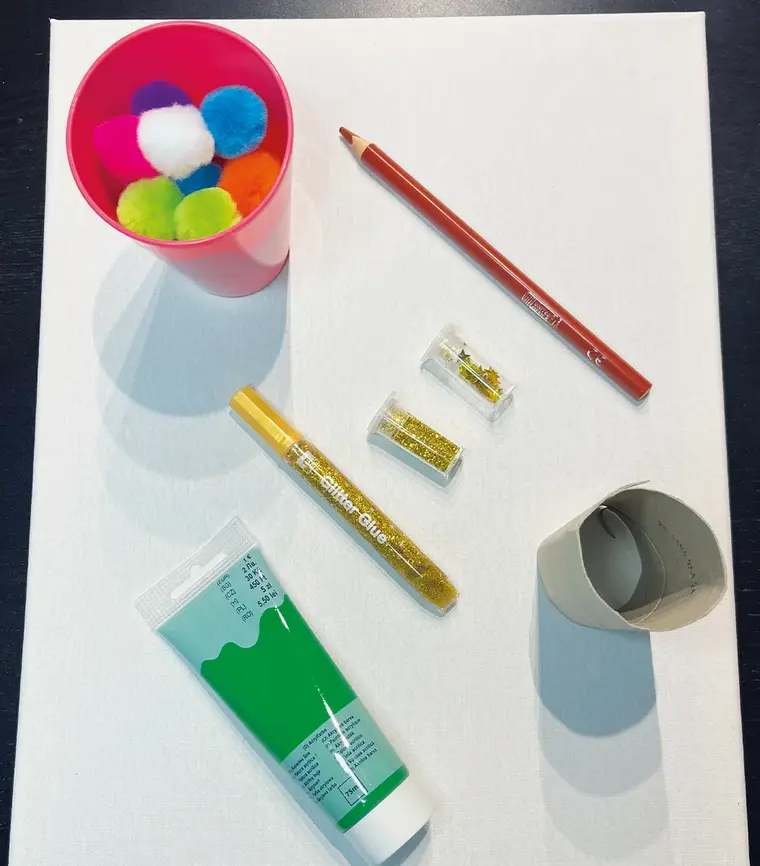 Die leere Toilettenpapierrolle gut in die grüne Farbe tunken und viele grüne Kreise auf die Leinwand oder das Papier in Form eines Weihnachtsbaumes tupfen. Die Farbe gut trockenen lassen.