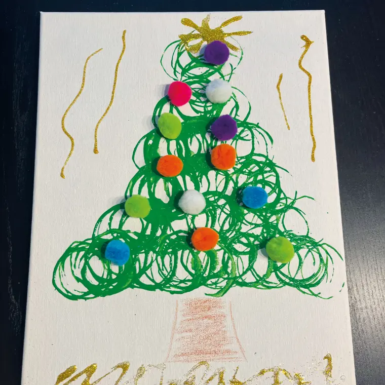 Mit dem braunen Stift dem Baum einen Stamm malen und anschließend die bunten Ponpons mit Kleber wie kleine Weihnachtsbaumkugeln auf dem Baum festkleben.