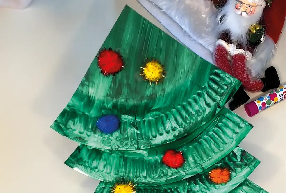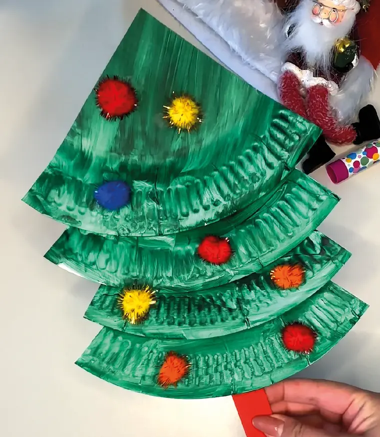 Sobald der Pappteller trocken ist, schneidest du ihn in vier Teile, sodass du vier Dreiecke erhältst. Jetzt legst du die Dreiecke übereinander, sodass sie wie ein Tannenbaum aussehen. Um die Dreiecke zusammenzuhalten, tackerst du sie aneinander. Jetzt kannst du deinen Tannenbaum nach Belieben dekorieren - vielleicht mit etwas Glitzer, Aufklebern oder kleinen Verzierungen, um ihm noch mehr Glanz zu verleihen.