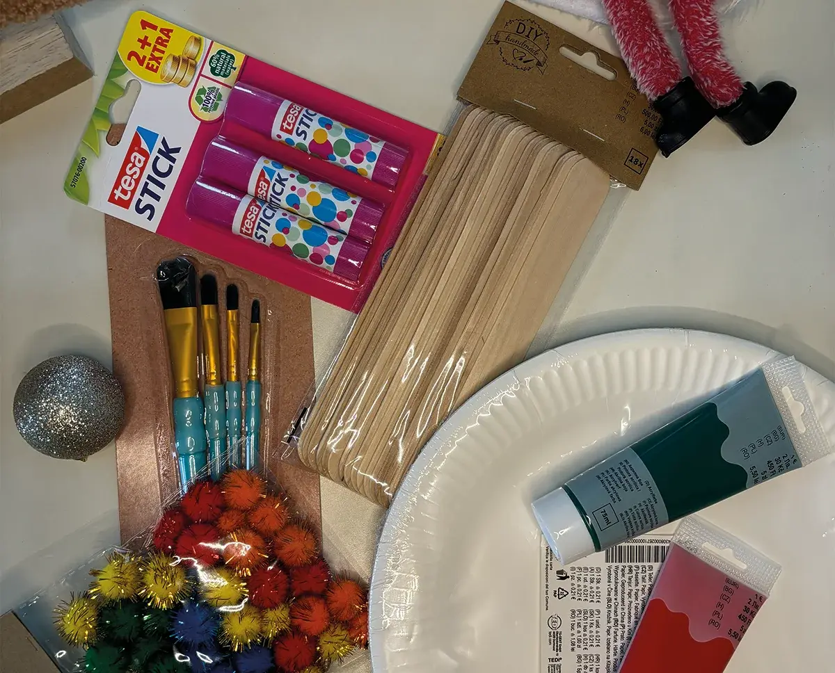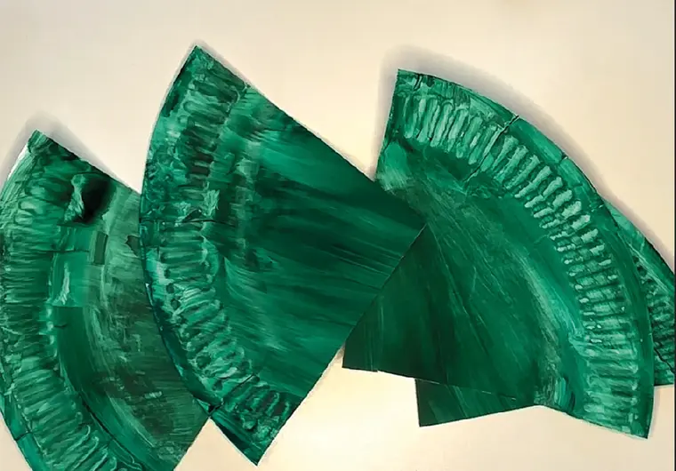 Zuerst nimmst du einen Pappteller und malst ihn gründlich mit grüner Farbe an. Lass ihn gut trocknen, während du den Holzstab mit roter Farbe bemalst.