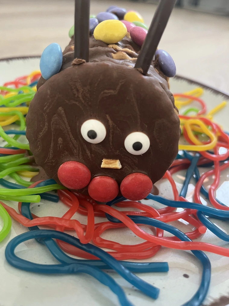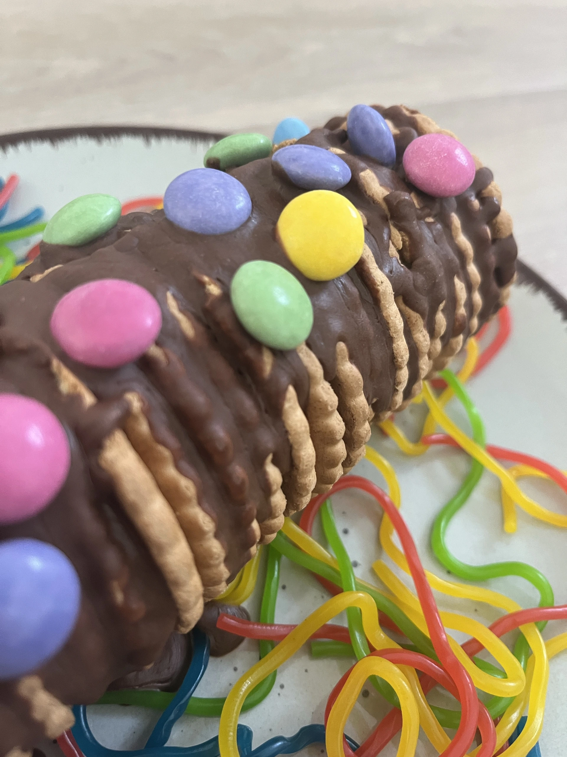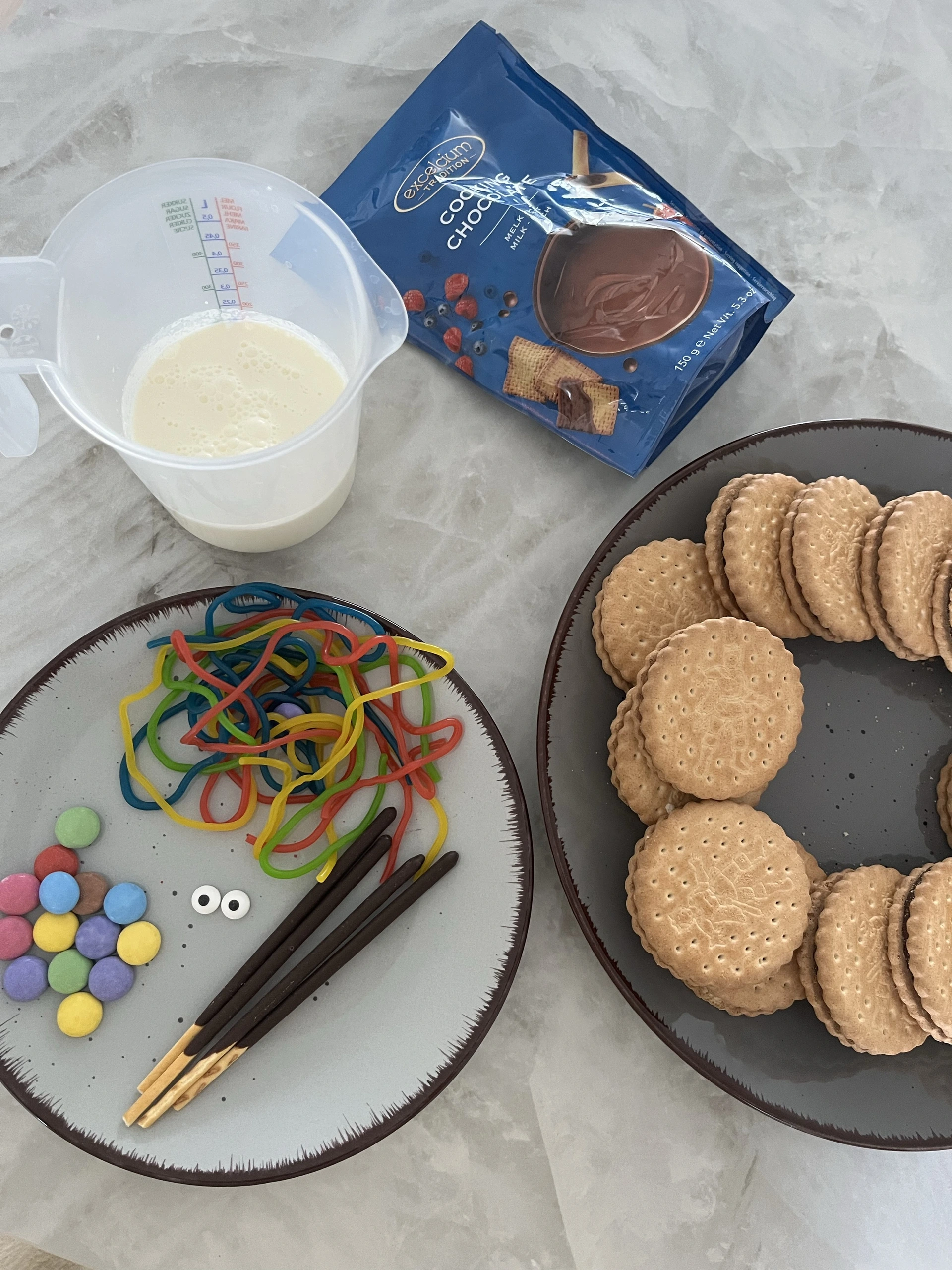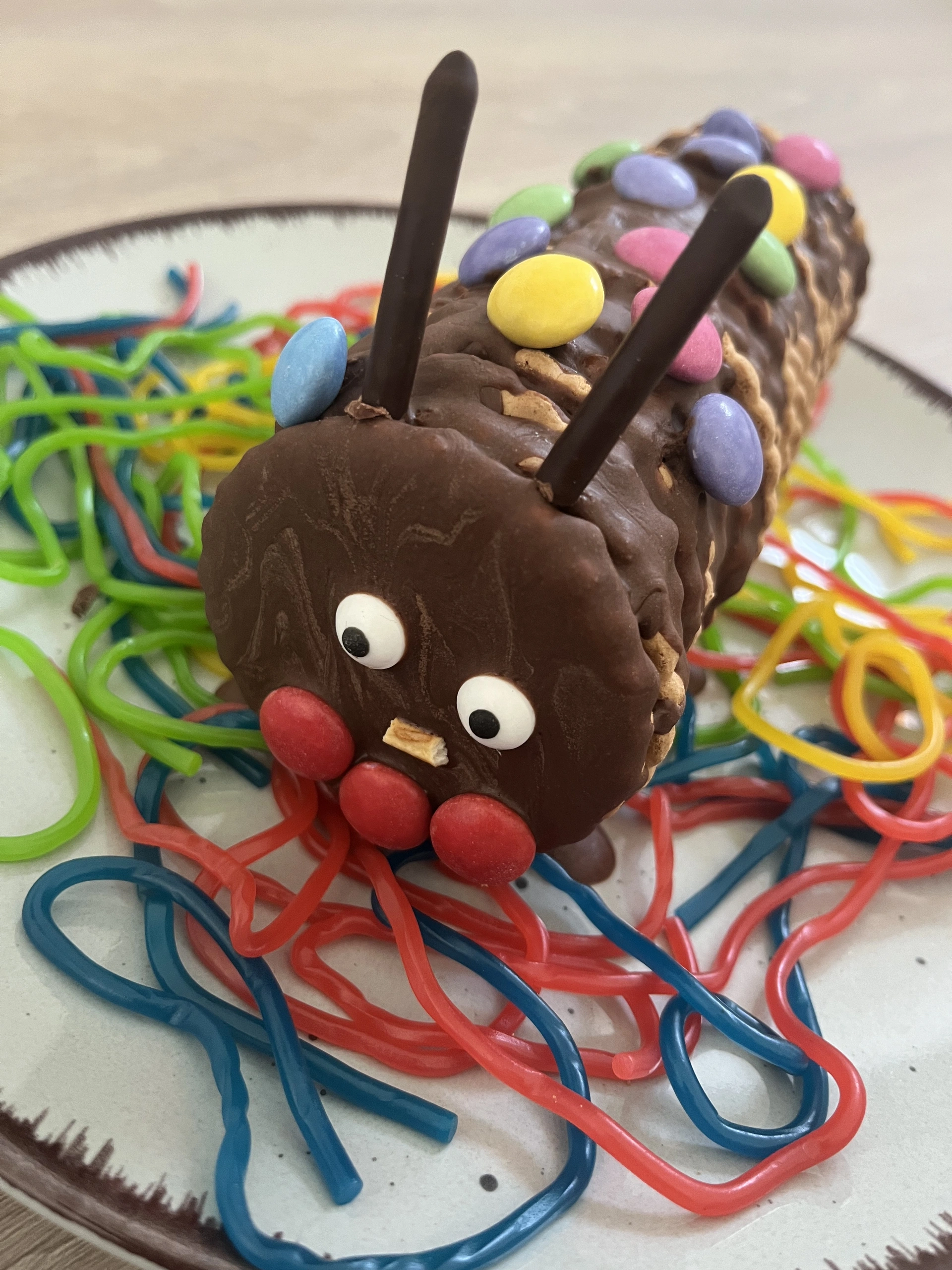 Die Schokoladen-Sahne als Kleber benutzen und die einzelnen Kekse mit der Schokolade zu einer Raupe zusammenkleben. Die Vorderseite der Raupe gut mit einem Rest Schokolade einstreichen, so dass hier ein Gesicht gezaubert werden kann.