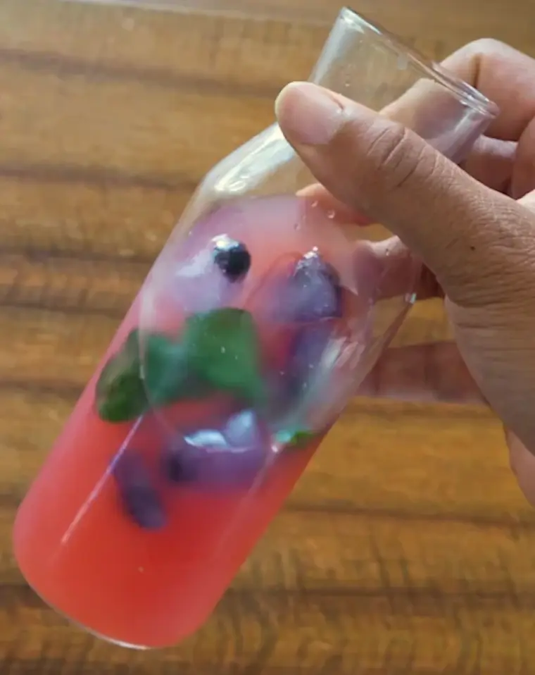 4. Die Mischung ins Glas geben und mit sprudelndem Mineralwasser aufgießen.