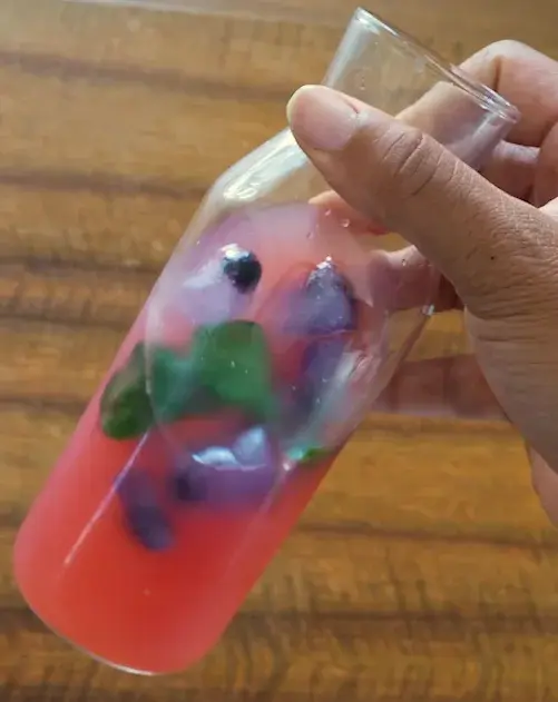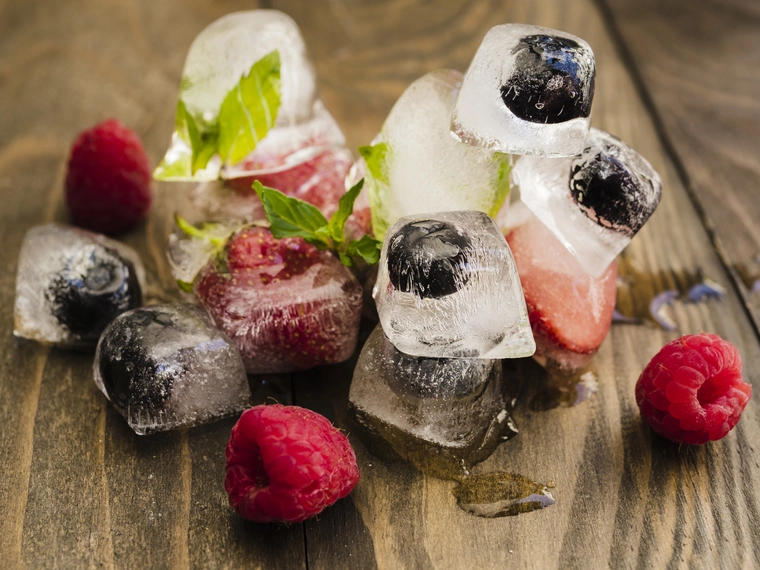1. Ein Glas bis zur Hälfte mit Eiswürfeln oder gefrorenen Beeren füllen.