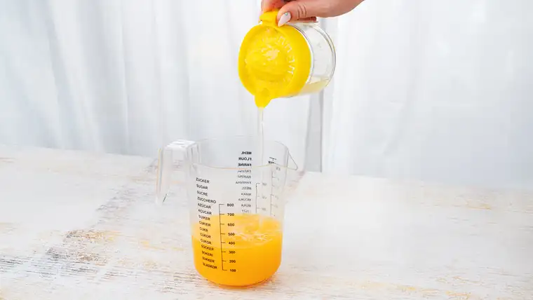 Dann presse alle Orangen aus. Das geht mit einer Saftpresse oder mit kräftigen Händen.