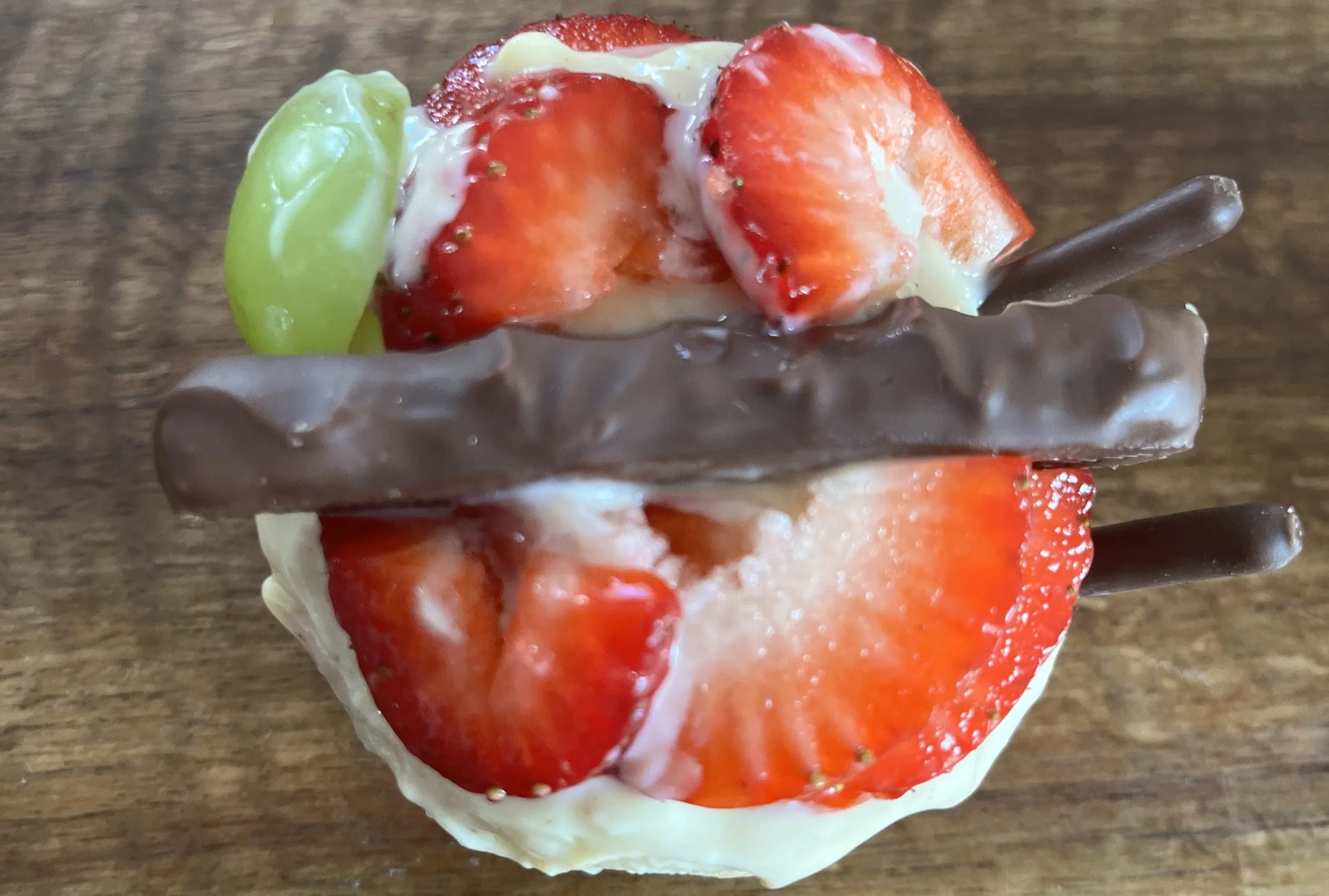 Erdbeerscheiben in Form der zwei Flügel. Die Weintrauben bilden den Abschluss der Flügel. Breche von zwei Schoko-Keksstäbchen das vordere Stück