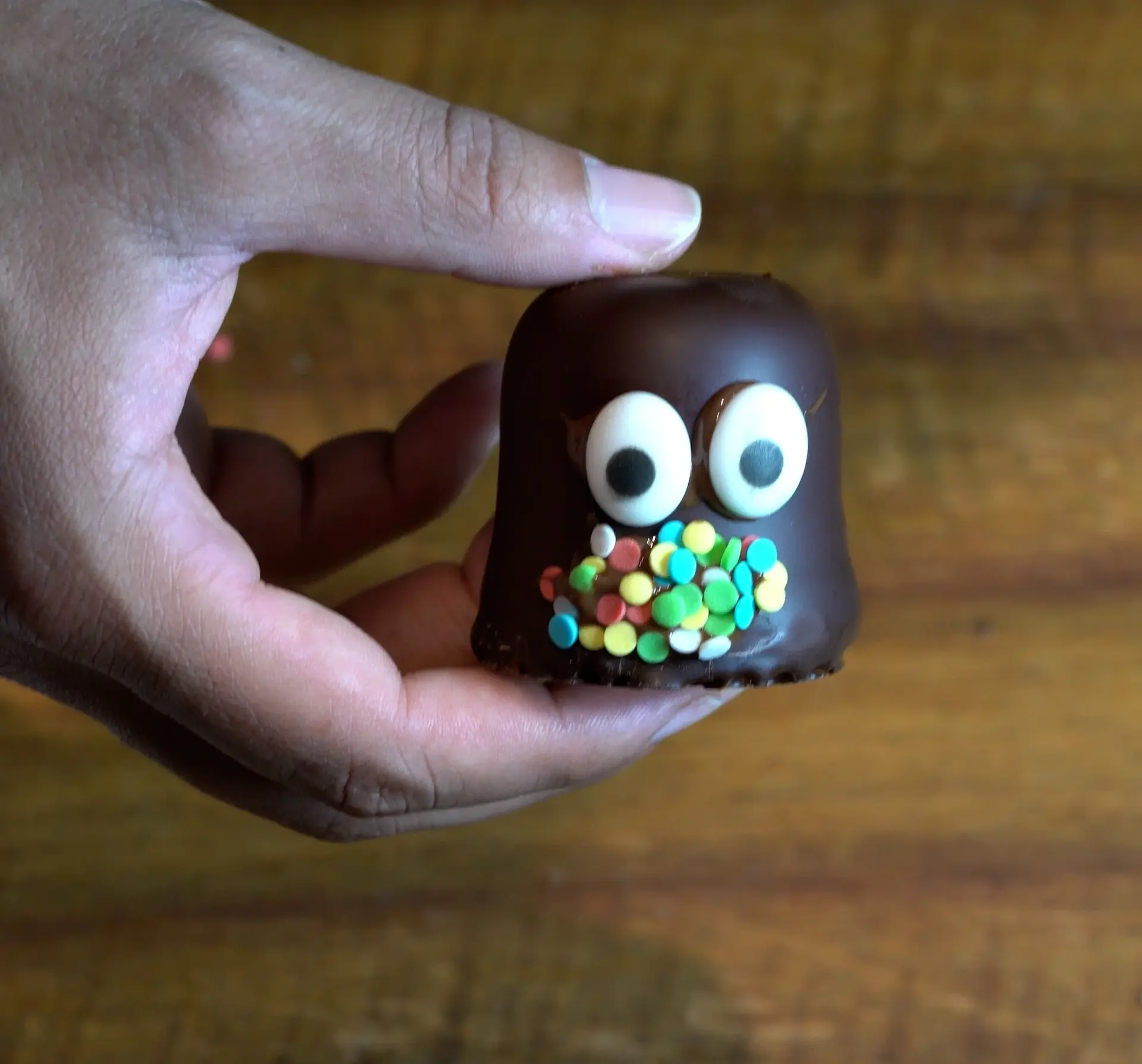 Als erstes wird dem Schokokuss ein leckeres und vor allem süßes Gesicht gezaubert. Hierfür die Kuvertüre schmelzen und als Kleber benutzen. So können leicht eine Zuckerherzen-Nase, die Zuckeraugen und natürlich ein kleiner Mund (z.B. aus Perlen) aufgeklebt werden.