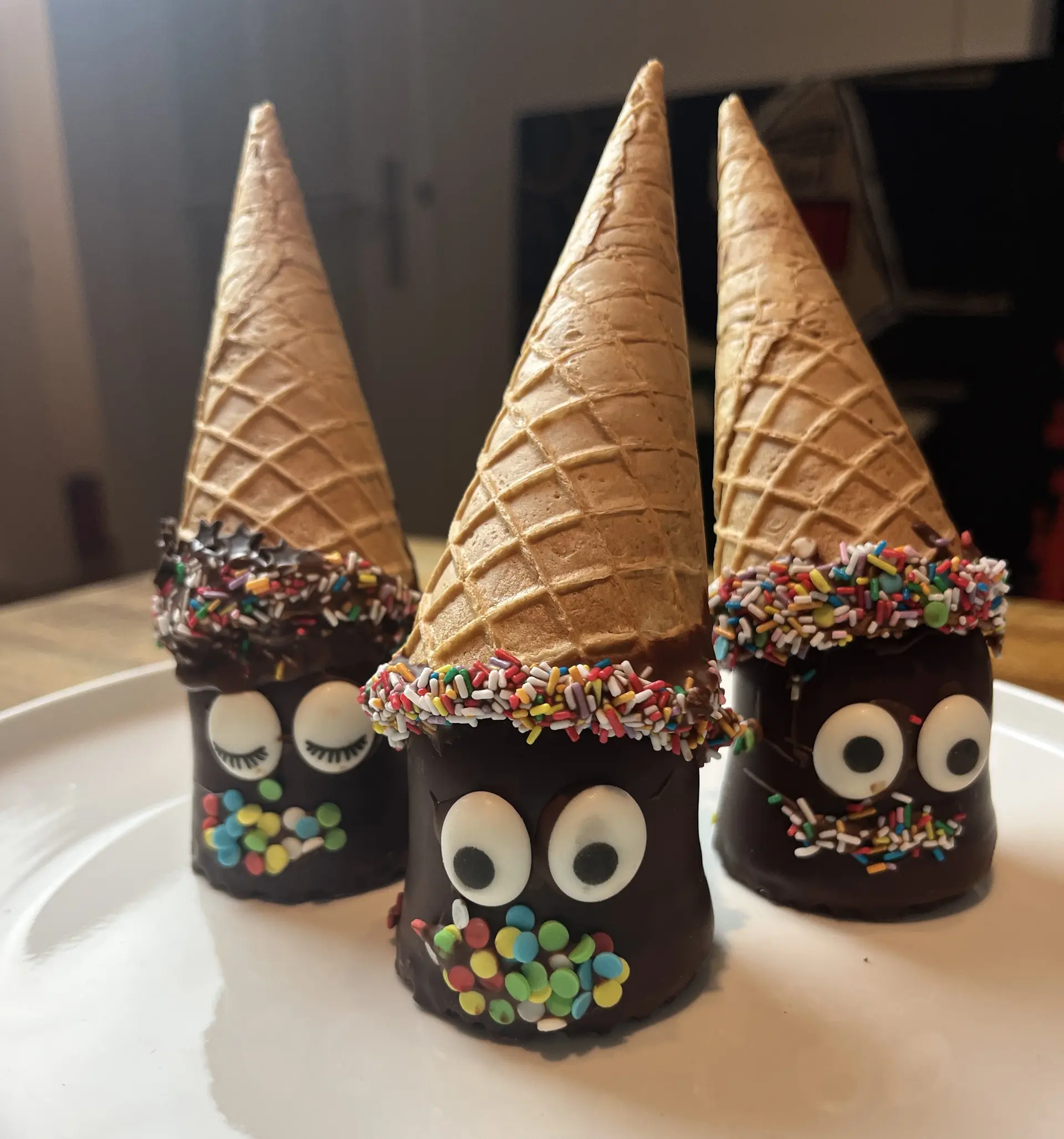 Nun kann der Eiswaffel Hut auf den Schokokuss gesetzt werden. Und fertig ist der kleine leckere Mann für die nächste Karnevalsparty.