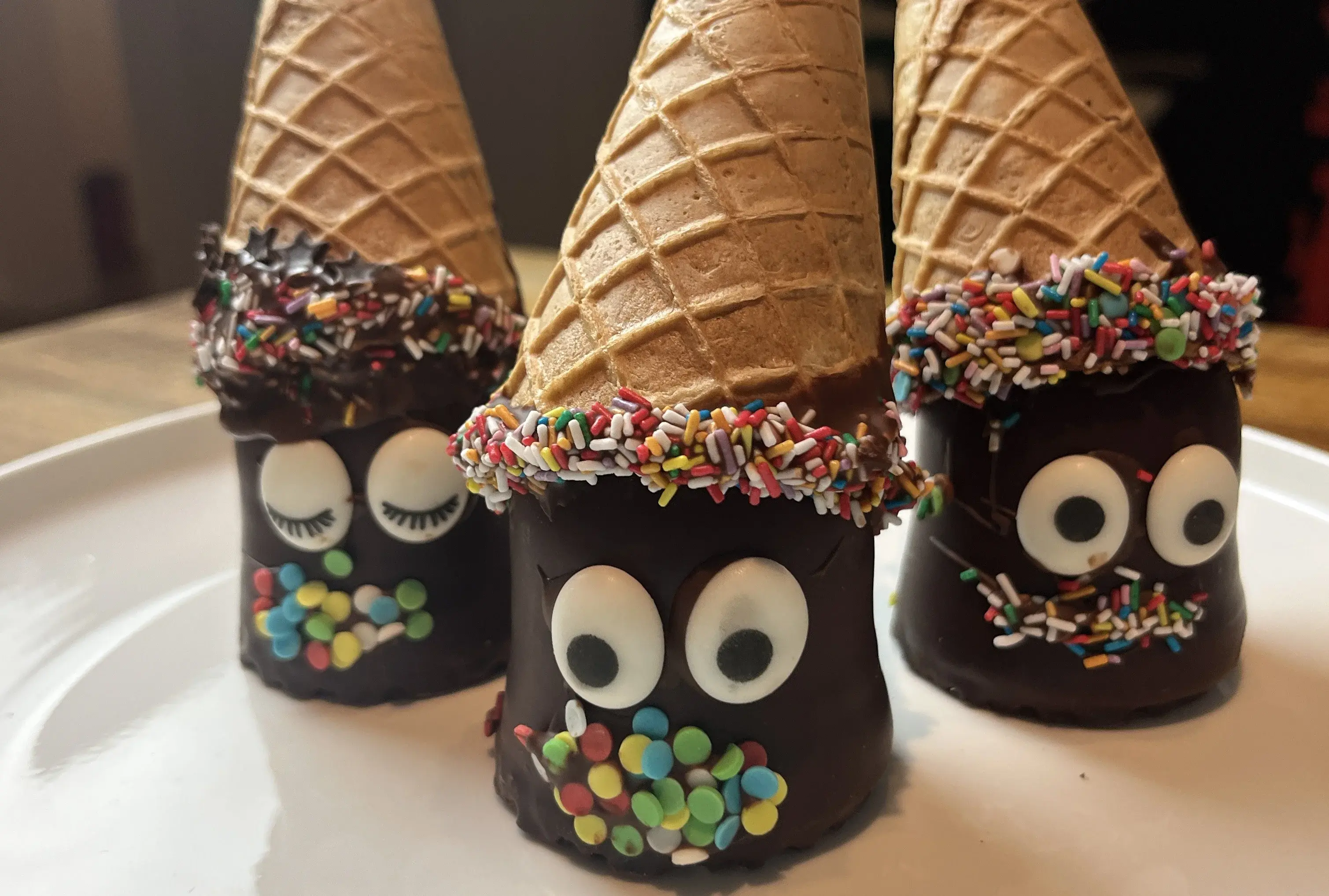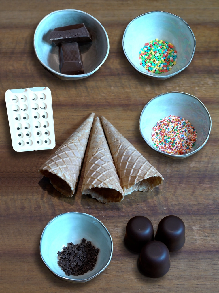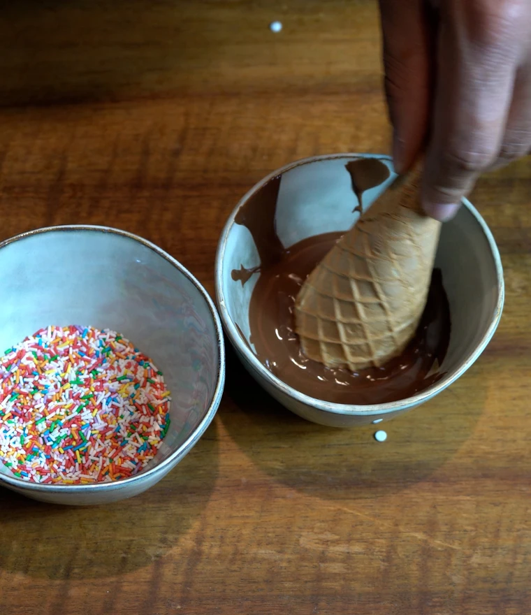 Die offene Seite des Hörnchens in die geschmolzene Kuvertüre tunken und den Schokostreifen mit Streuseln oder Perlen verzieren, dass ein bunter Haaransatz entsteht.