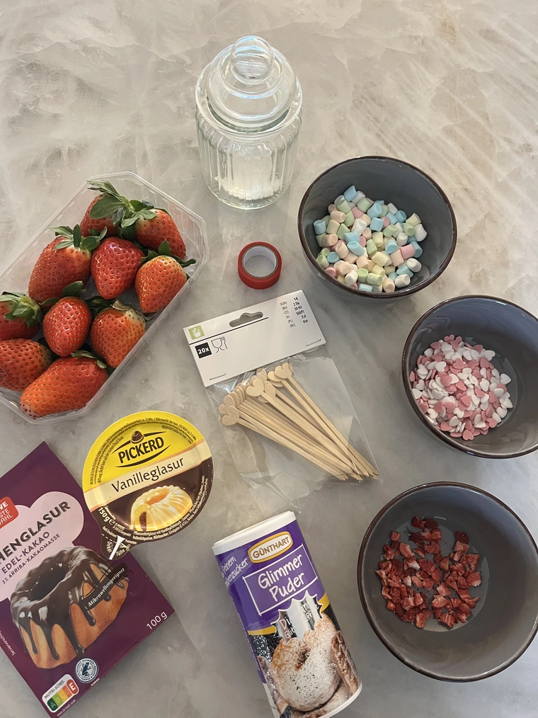 Nun kann die Glasur, egal ob Schoko oder Vanille, nach Anleitung geschmolzen werden. Dies klappt sowohl in der Mikrowelle, als auch im Wasserbad sehr gut. Die Erdbeer-Spieße in die flüssige Glasur tunken und sofort die Deko drauf streuseln.
