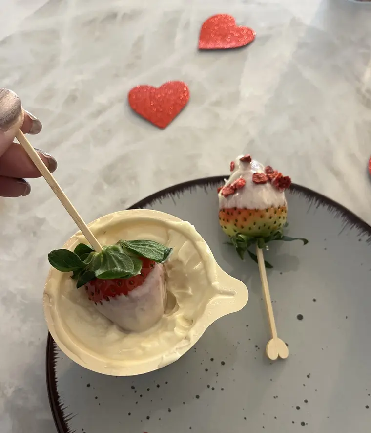Als erstes werden die Erdbeeren gewaschen, gut abgetrocknet und die Holzstäbchen mittig in die Beeren gepikst.