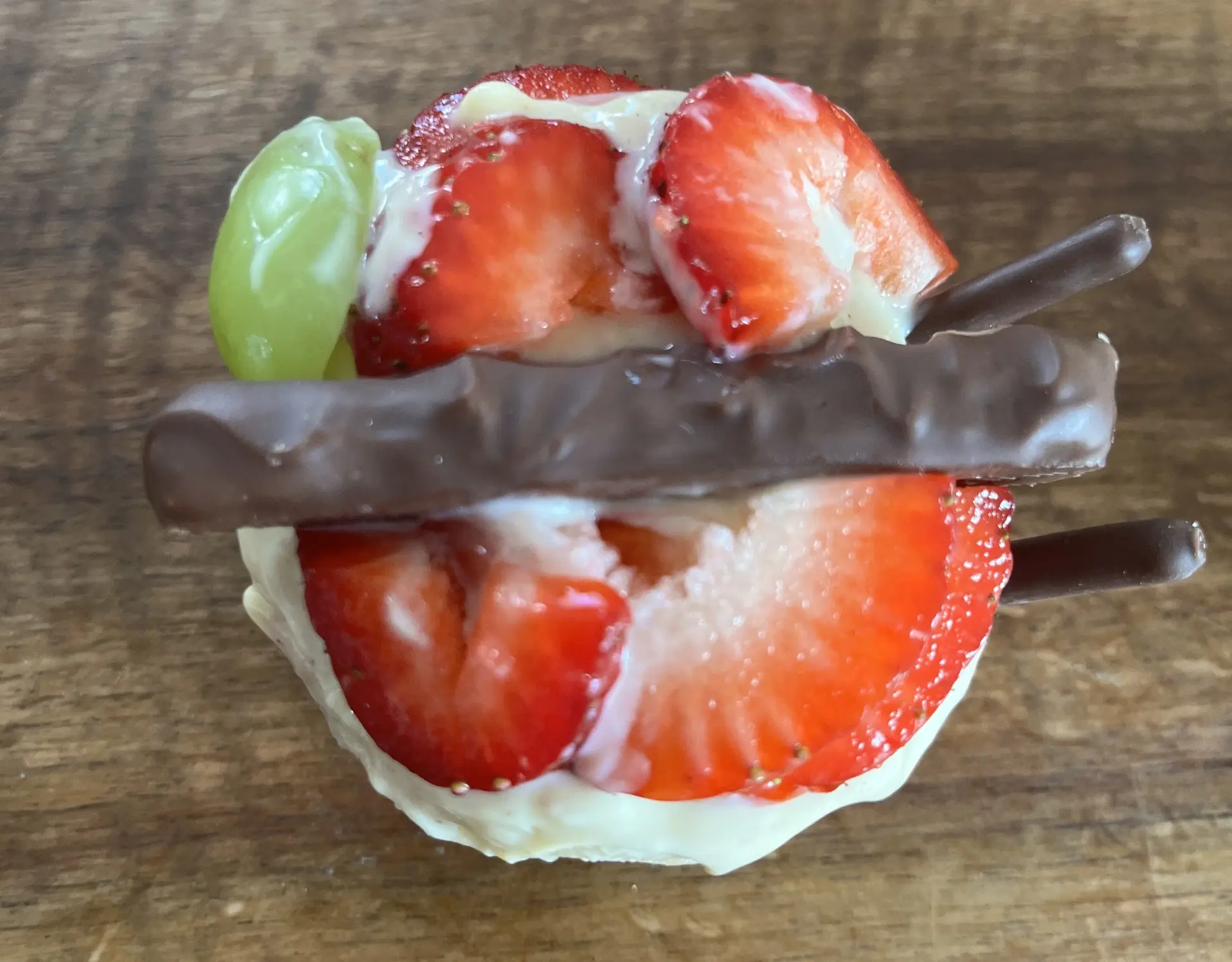 Erdbeerscheiben in Form der zwei Flügel. Die Weintrauben bilden den Abschluss der Flügel. Breche von zwei Schoko-Keksstäbchen das vordere Stück
