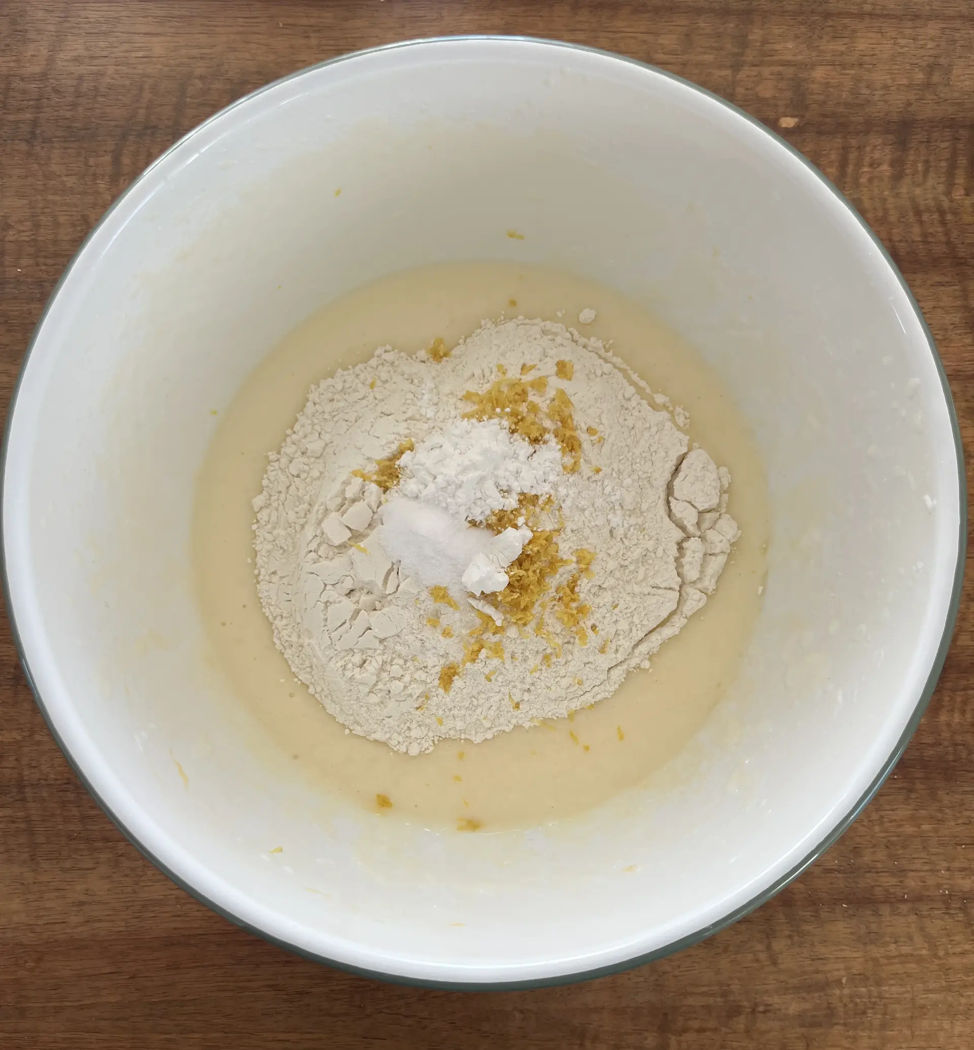 Schlage das Ei in einer Rührschüssel auf und verrühre es, bis es schaumig ist. Danach den Zucker, Vanillezucker, das Öl und den Zitronenjoghurt dazugeben und alles zusammen kräftig verrühren. Anschließend das Mehl mit dem Backpulver, Natron und dem Citroback/Zitronenschalenpulver gut vermengen und behutsam unter die Eimasse heben.