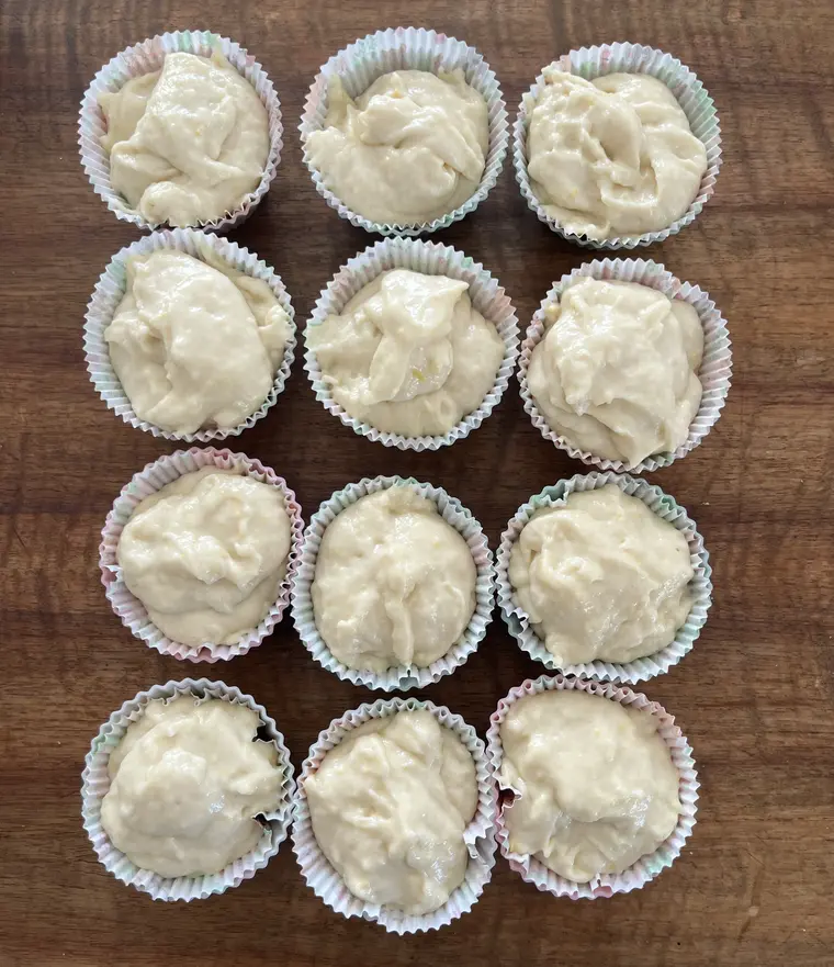 Die Muffinförmchen aus Papier in die Vertiefungen im Muffinbackblech stecken und den Zitronenteig hineinfüllen.Nun bäckst du die Muffins im vorgeheizten Backofen bei 180 °C Ober-/Unterhitze oder 160 °C Heißluft ungefähr 20-25 Minuten. Lass die Muffins auskühlen und löse sie dann aus dem