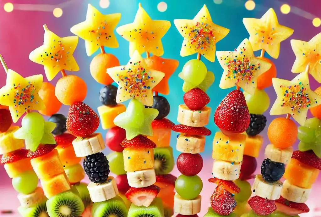 Setzt die ausgestochenen Sterne (z.B. aus Melone oder Ananas) auf das obere Ende jedes Spießes. Sie sollen wie die Spitze eines Zauberstabs aussehen.