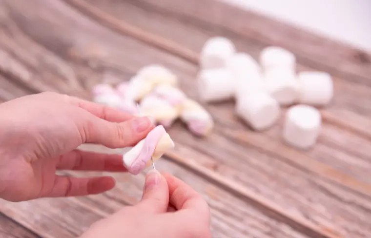 Jetzt versucht so viele Marshmallows wie möglich auf das Schmuckband zu ziehen. Wer am Ende der Zeit die meisten Marshmallows hat, hat gewonnen.