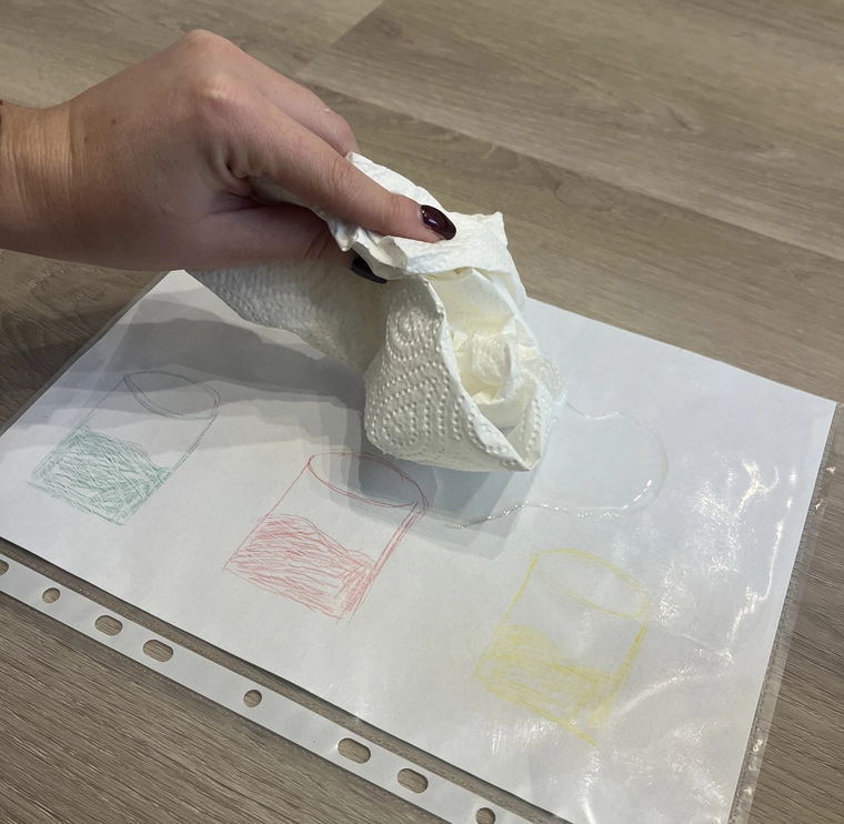 Male auf das weiße Papier drei Gläser in bunten Farben (z.B. Rot, Grün und Gelb). Schiebe dann das Papier in die Klarsichtfolie.